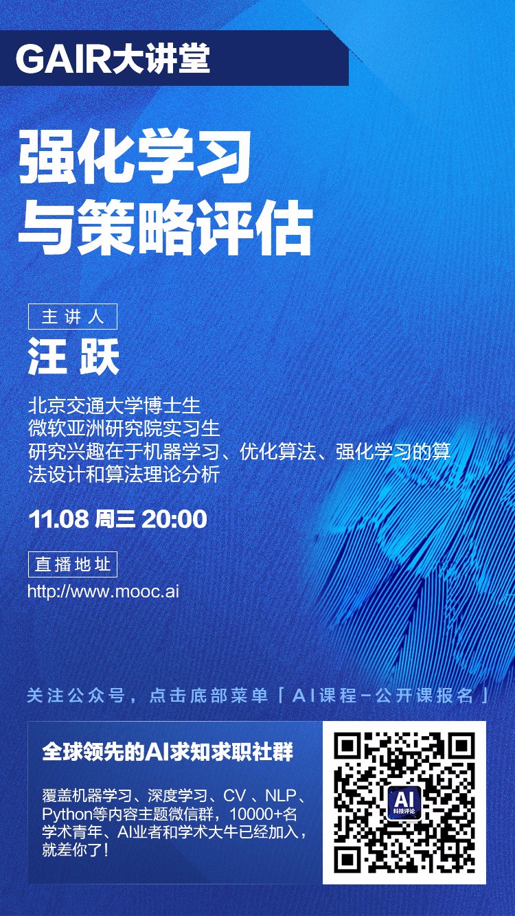 汪跃,北京交通大学数学系三年级博士生,专业为概率论与数理统计,导师是马志明院士。 他的研究兴趣在于机器学习、优化算法、强化学习的算法设计和算法理论分析。 在此之前,他于2015年在北京交通大学理学院院获得学士学位。 他现在微软亚洲研究院机器学习组实习。