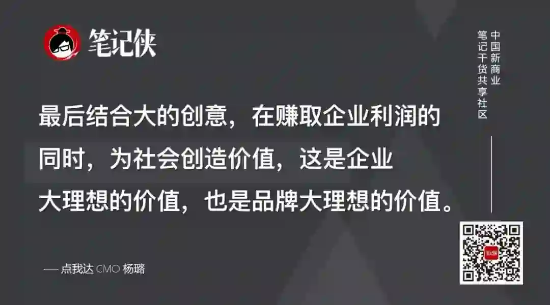 最后结合大的创意,在赚取企业利润的同时,为社会创造价值,这是企业大理想的价值,也是品牌大理想的价值。