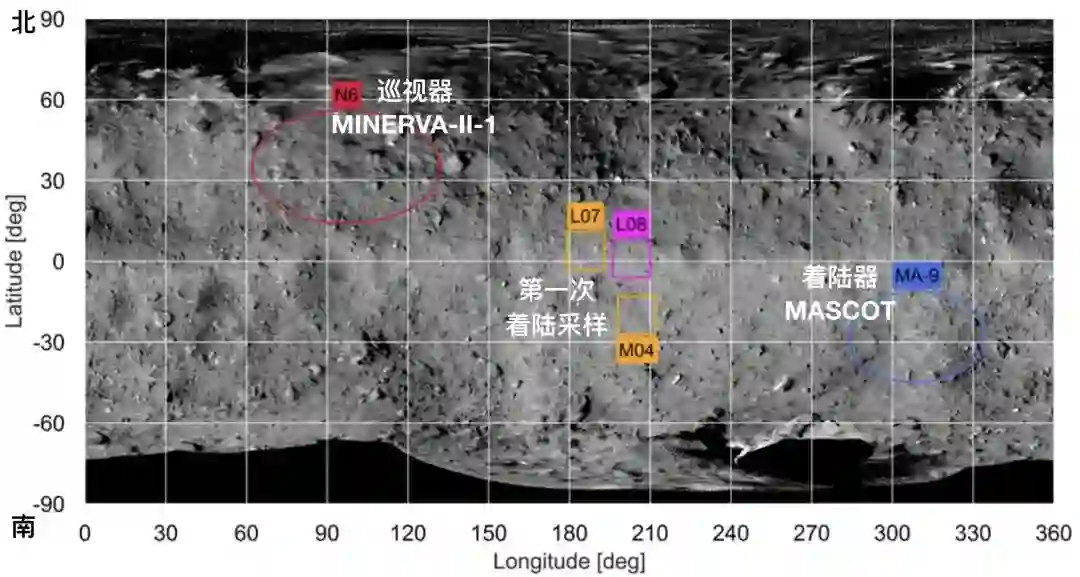 选定的着陆点位置,其中L和M分别表示低纬度和中纬度。别忘了小行星“龙宫”的直径只有约900米,所以正方形框的边长只有约100米。来源:JAXA、东京大学等