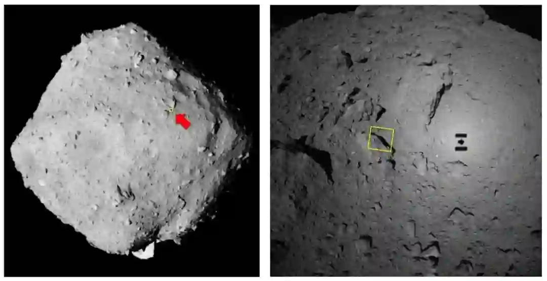 ↓ 拍摄的区域是红色箭头所指的黄框中的范围,而且……隼鸟2号还拍到自己的影子!