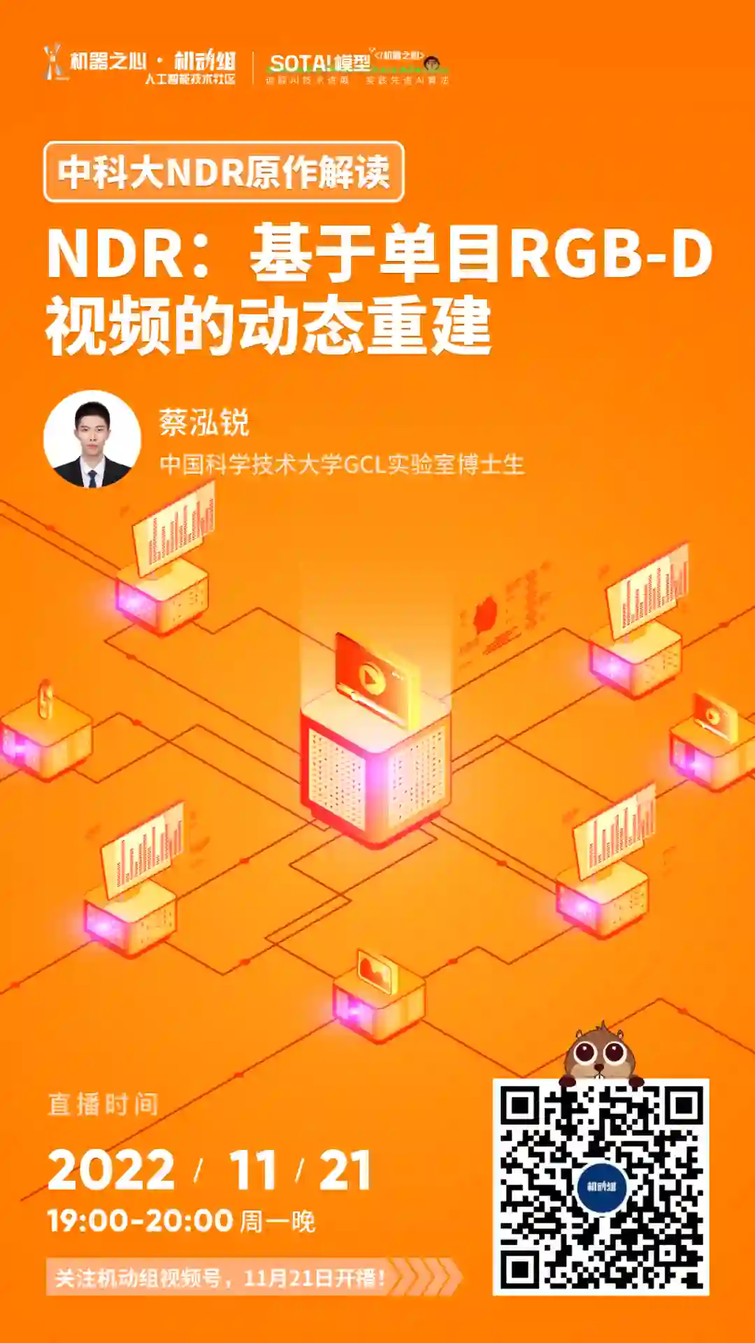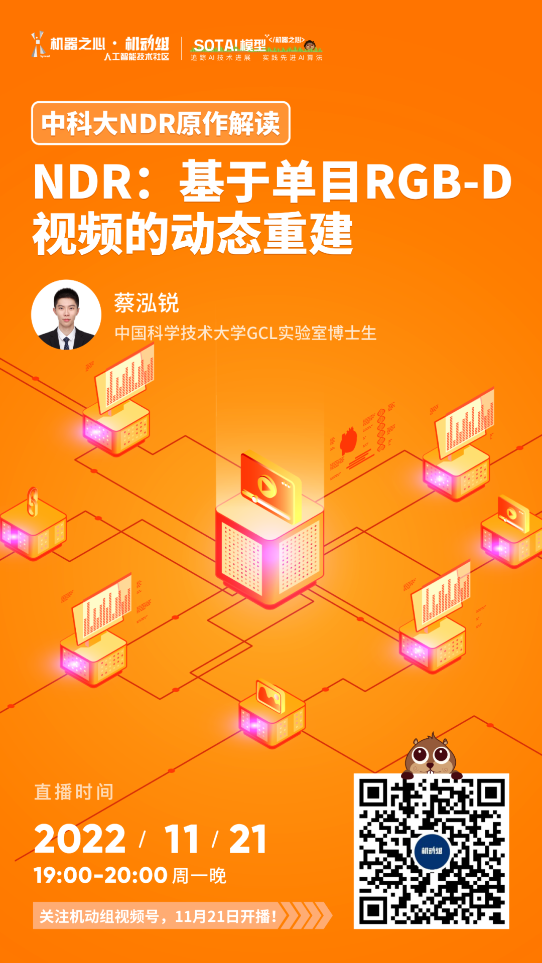 机器之心最新一期线上分享邀请到了中国科学技术大学 GCL 实验室三维视觉课题组博士生蔡泓锐(导师为张举勇教授),介绍神经动态重建方案 NDR。