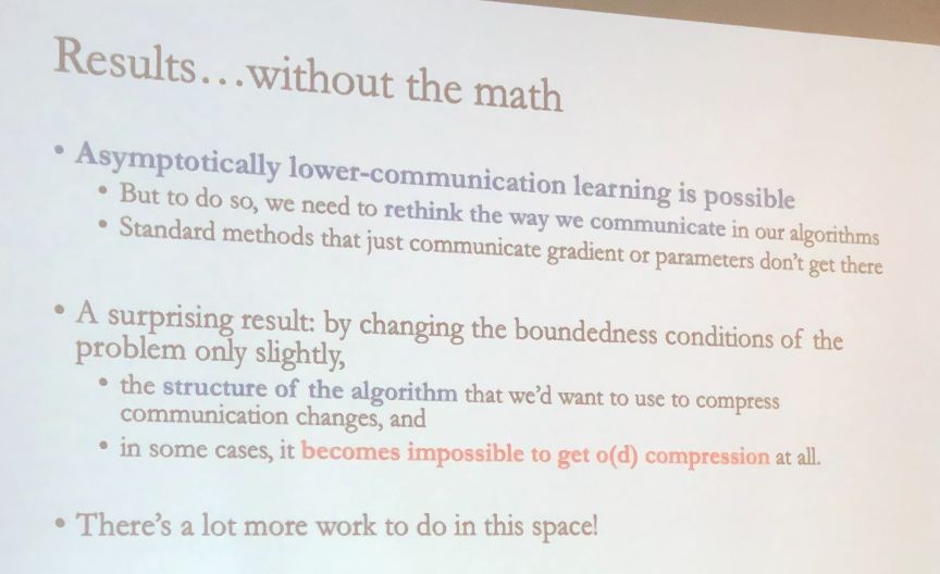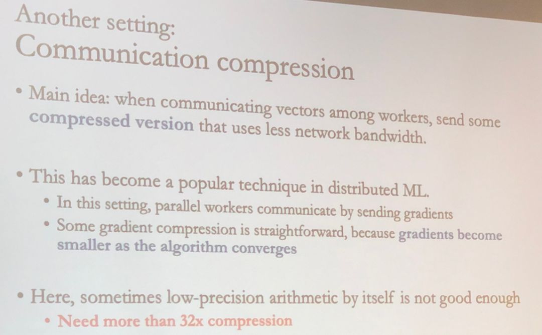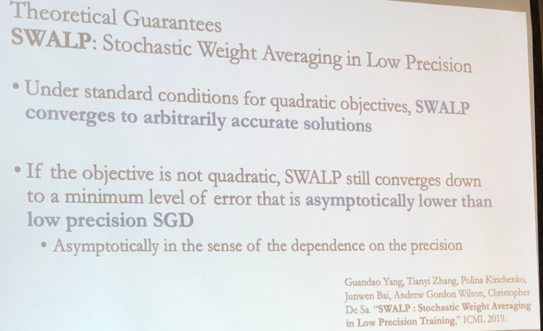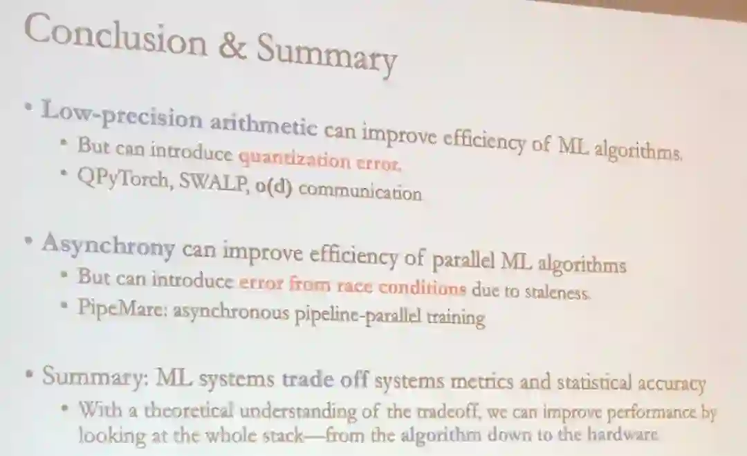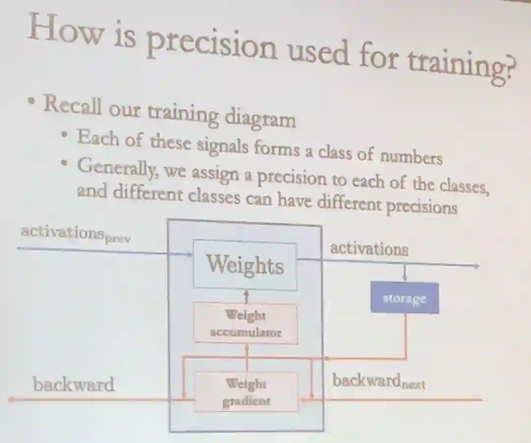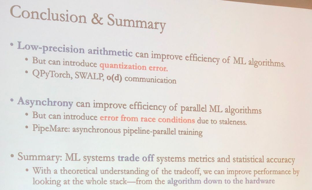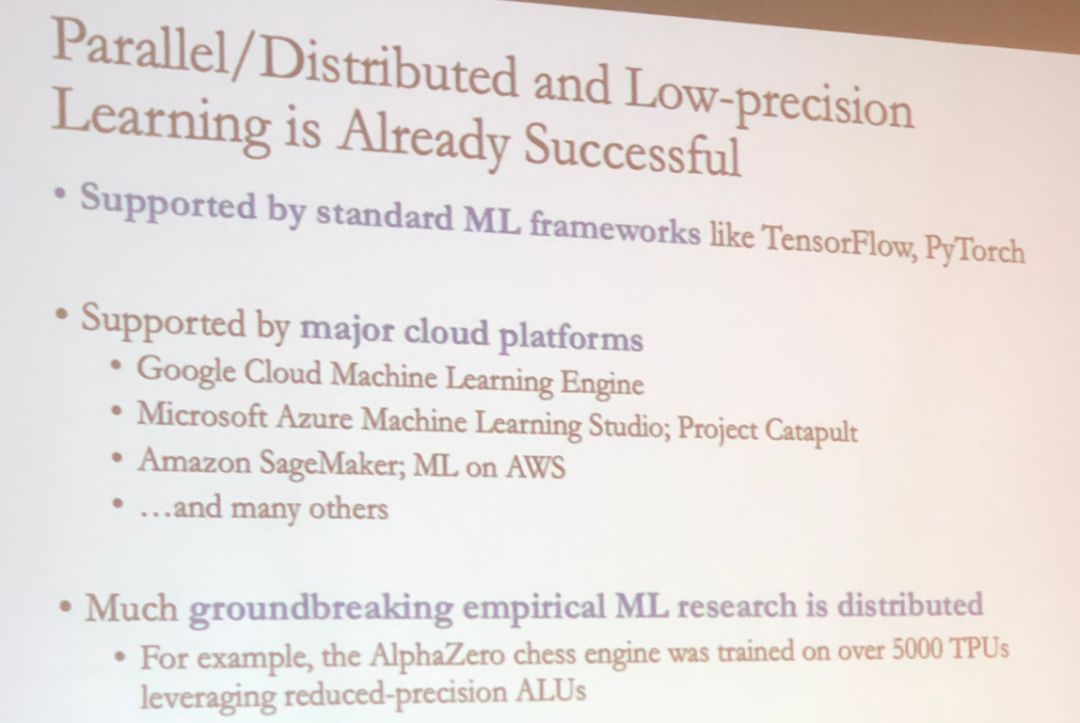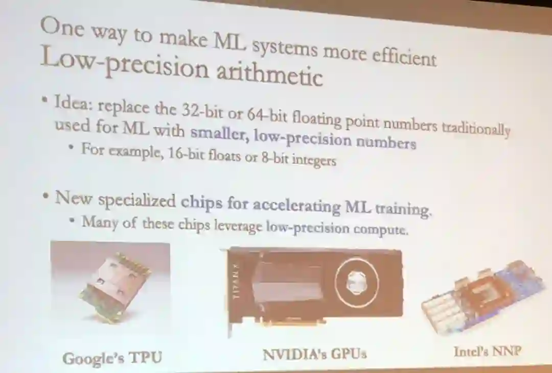 De Sa 在演讲中介绍了如何通过应用不同的数值精度来提升机器学习的效率,尤其是在分布式系统上。
