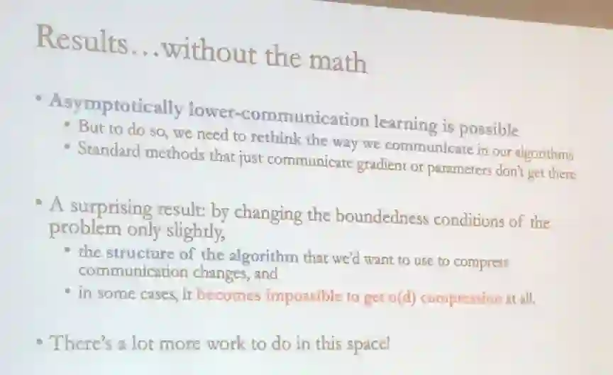有可能在学习中渐进式地降低通信量,但要做到这一点,我们需要重新思考算法中通信的方式,只通信梯度或参数的标准方法无法实现做到这一点。