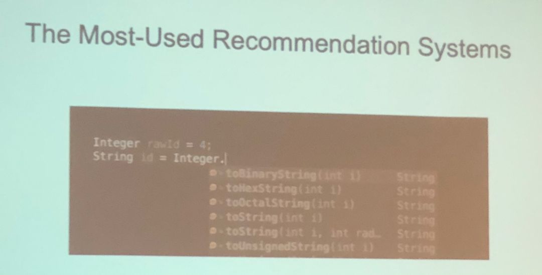 她也说各种机器学习平台的不同 API 很让开发者头疼,因此她建议为机器学习开发过程添加一个代码推荐系统,就像 Java 集成开发环境的自动补全,比如 IntelliJ 或者 Eclipse。