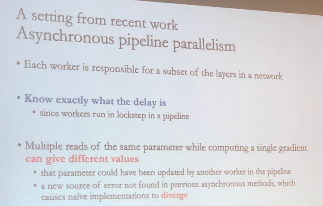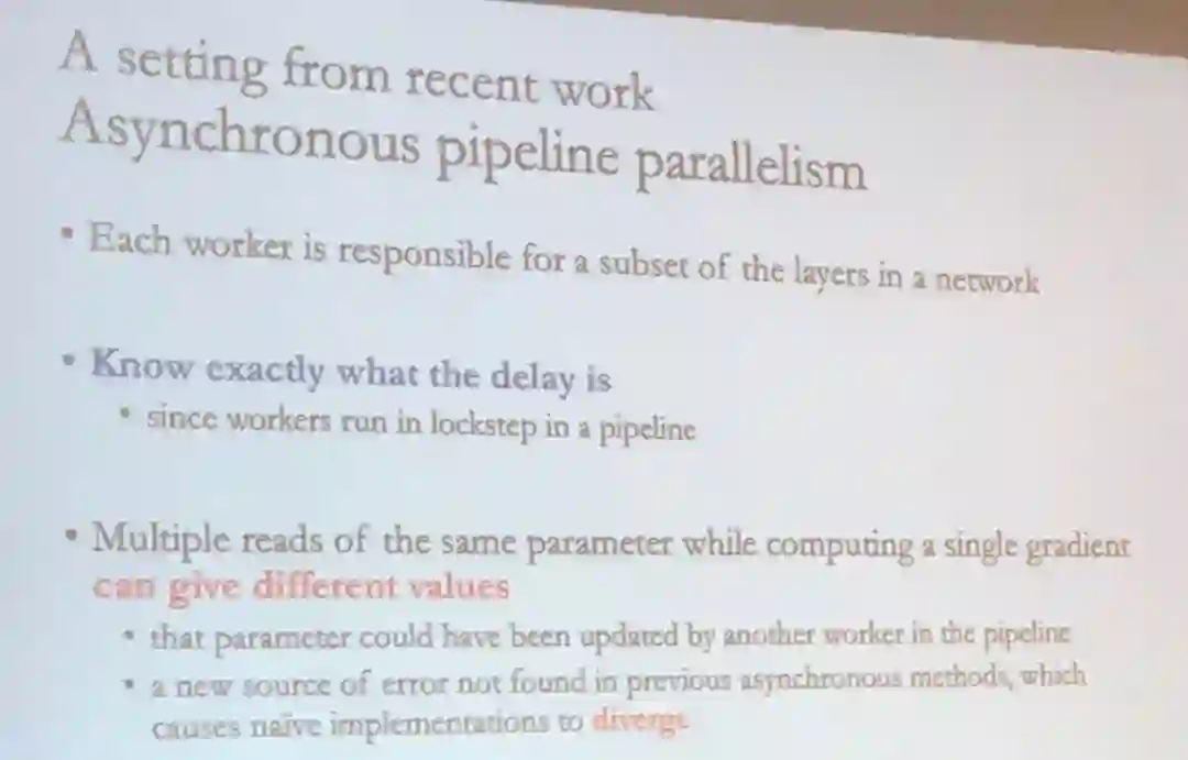 但是,在计算一个梯度时,同一参数的多个读取可能给出不同的值,而这个参数可能已被工作管道中的另一个计算节点更新过了。