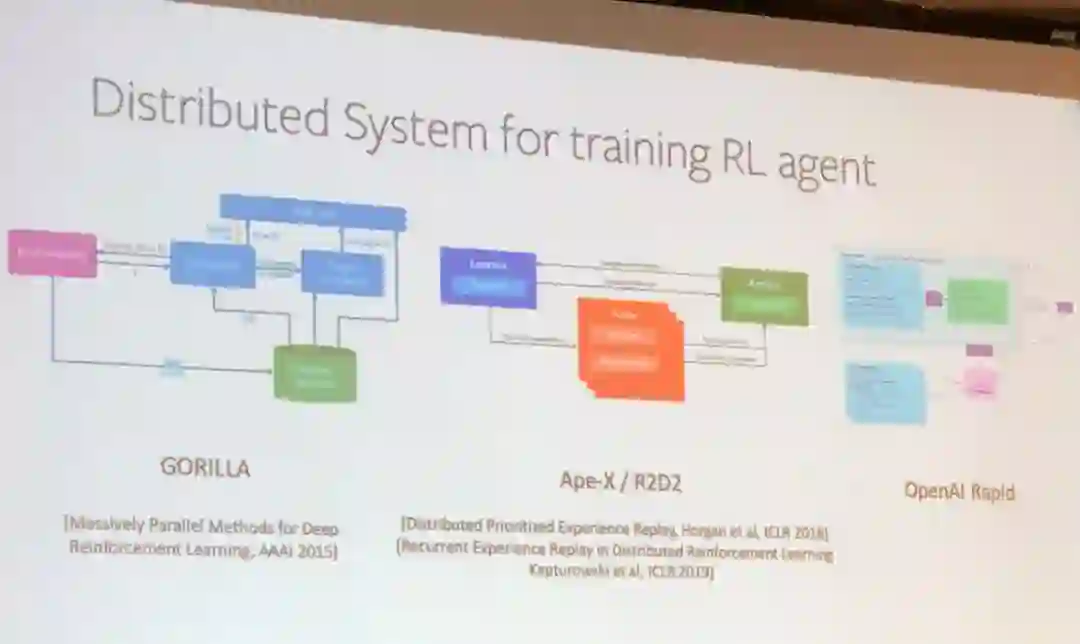 田渊栋的演讲首先介绍了用于训练强化学习智能体的三种分布式系统。