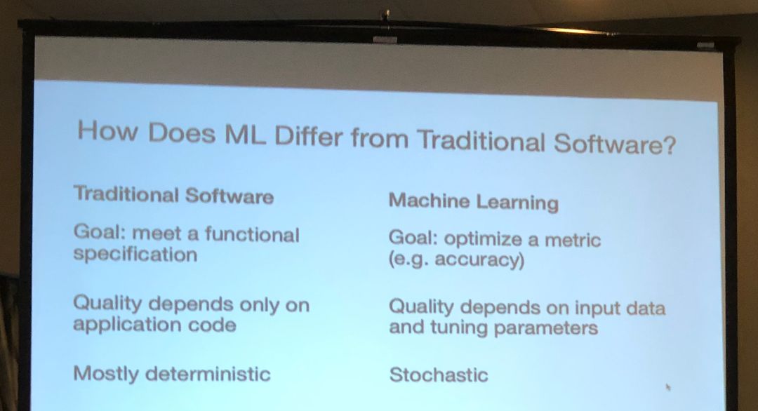 在识别机器学习系统所面临的特有挑战之前,Zaharia 先介绍了传统软件开发与机器学习软件开发的差异。