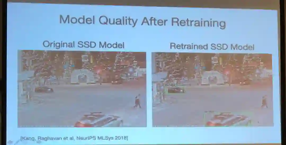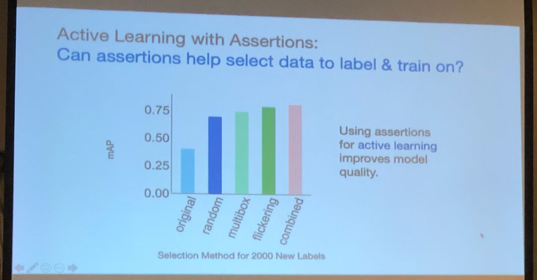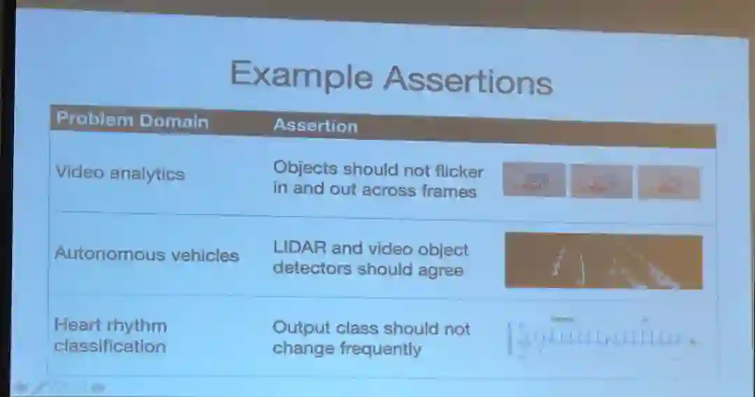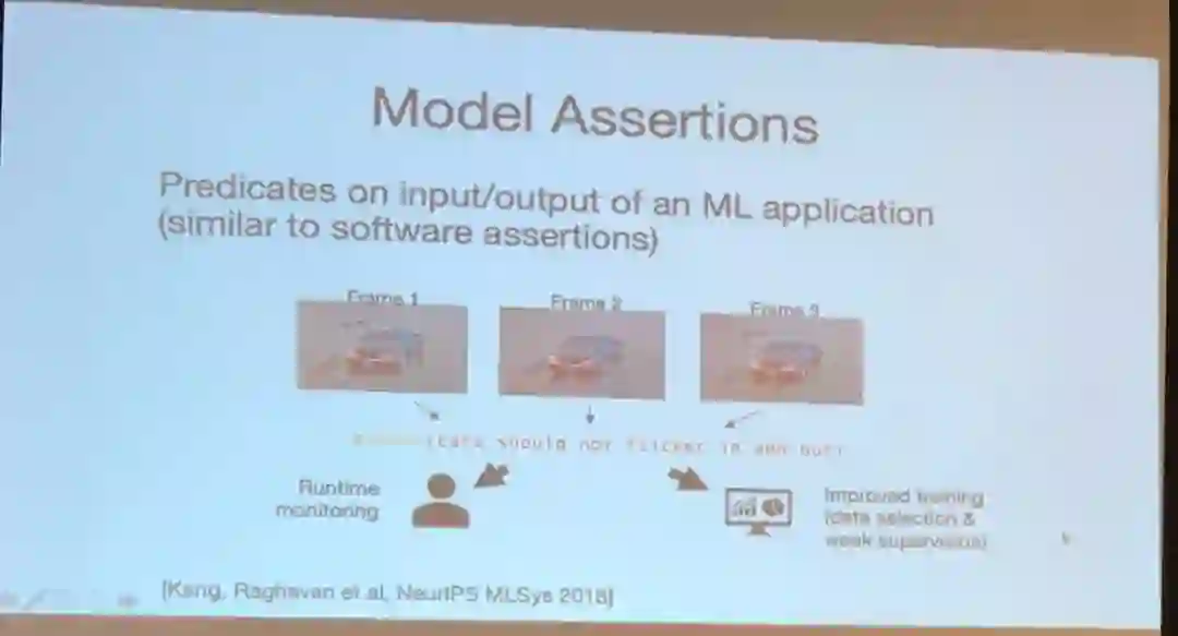 在质量保证(QA)和调试工具方面,Zaharia 讨论了他的团队在 NeurIPS 2018 上提出的模型断言(model assertion)工作。