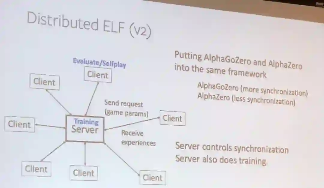 田渊栋详细介绍了分布式 ELF 系统的第 1 版和第 2 版,其中第 2 版相对前一版增加了一些加速强化学习训练的技巧。