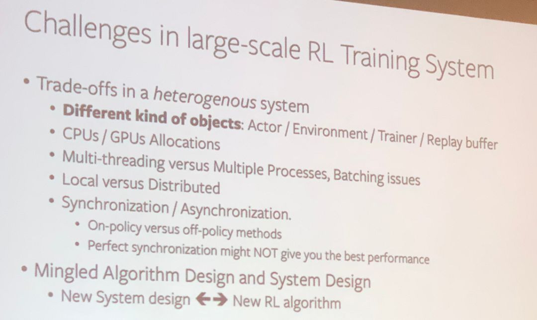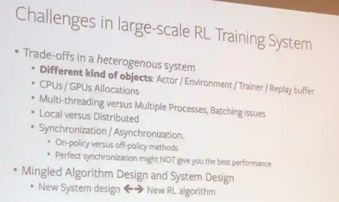 不同类型的目标(执行器、环境、训练器、重放缓存)、CPU 与 GPU 的分配、多线程与多处理、分批问题、局部与分布式、同步与异步(在策略与离策略,完美的同步不可能提供最好的性能)。