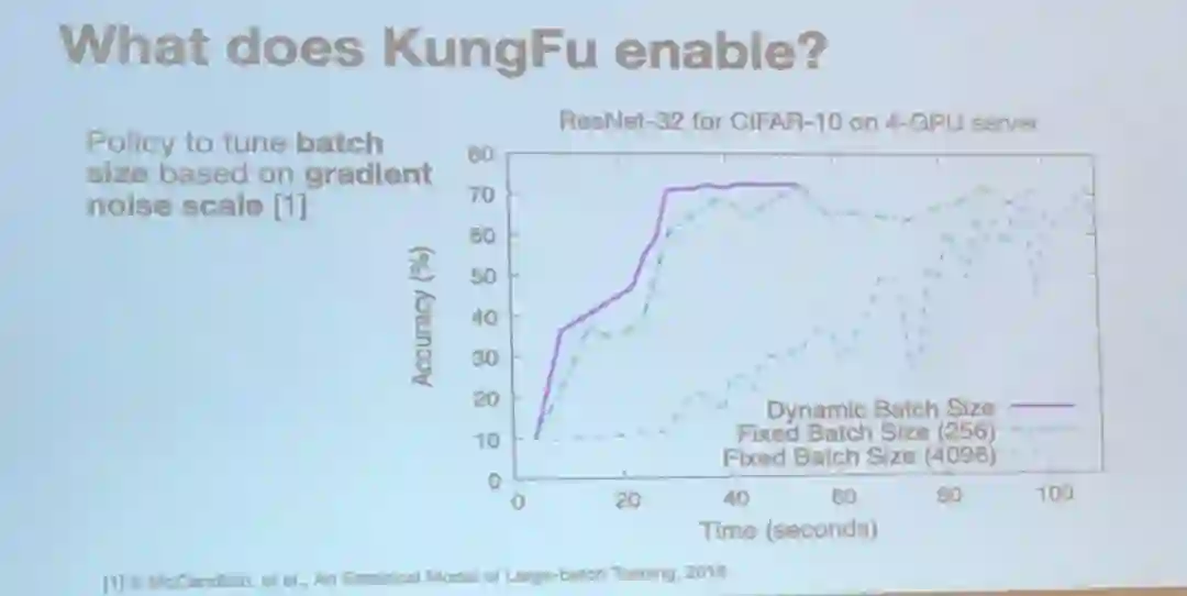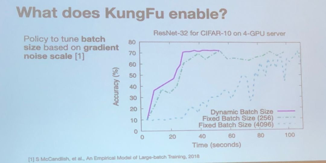 通过基于梯度噪声扩展调整批大小,研究者展示了 KungFu 的能力。