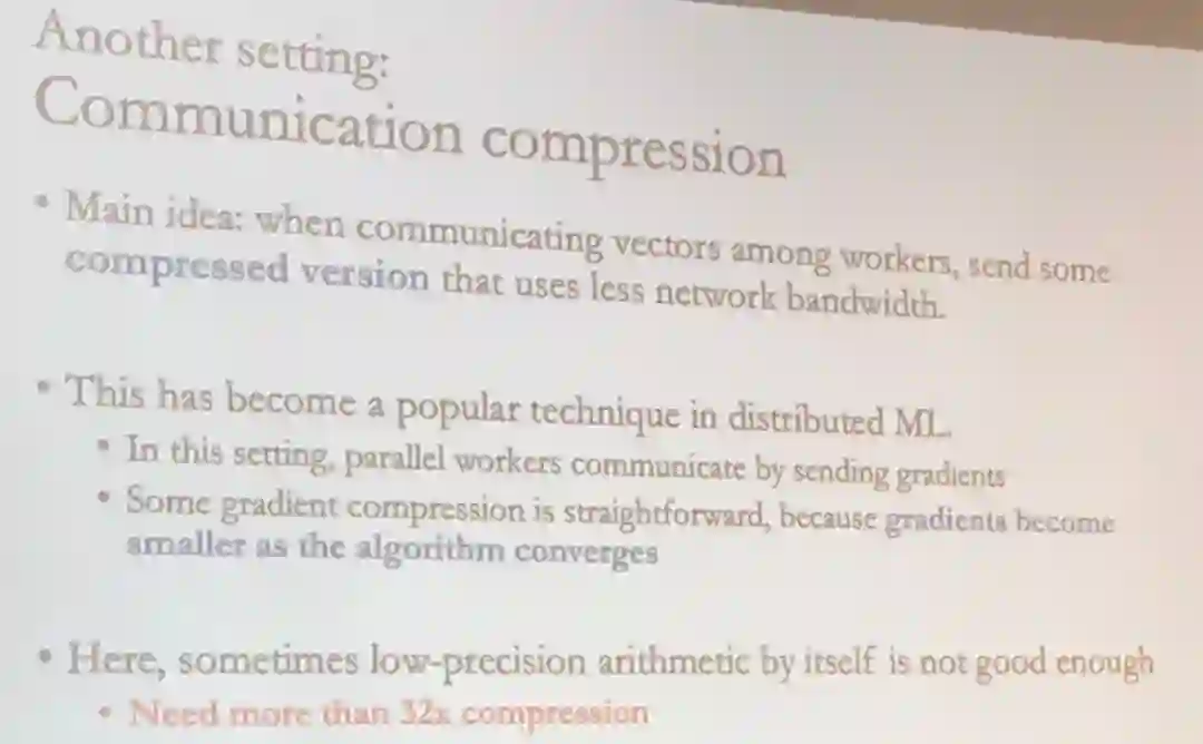 通信压缩的主要思想是在计算节点之间传递向量时,使用带宽需求更低的压缩版本。
