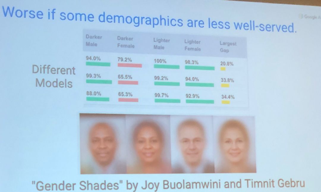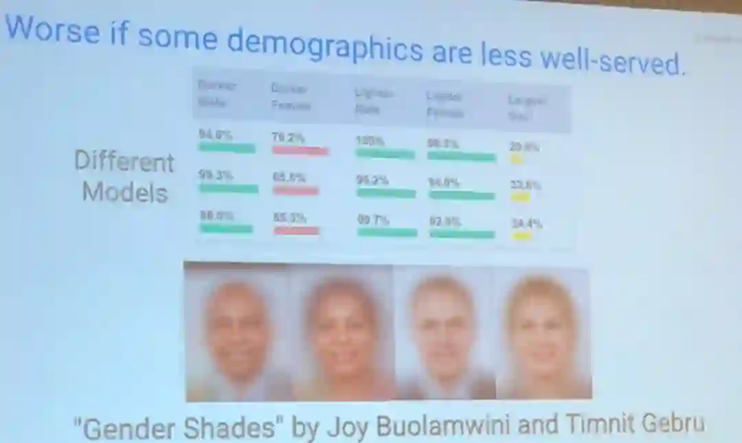 Beutel 以「Gender Shades」为例讨论了机器学习中不公平,其展示了识别模型在识别深色皮肤的女性时准确度显著下降的情况。