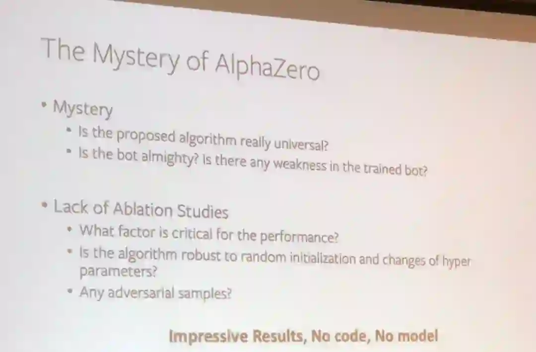 田渊栋在介绍基于 ELF 系统训练的 OpenGo 模型之前揶揄了一番谷歌 AlphaZero: