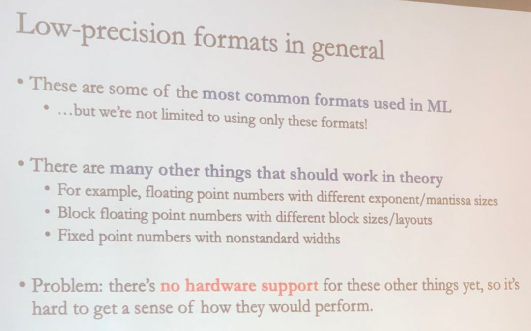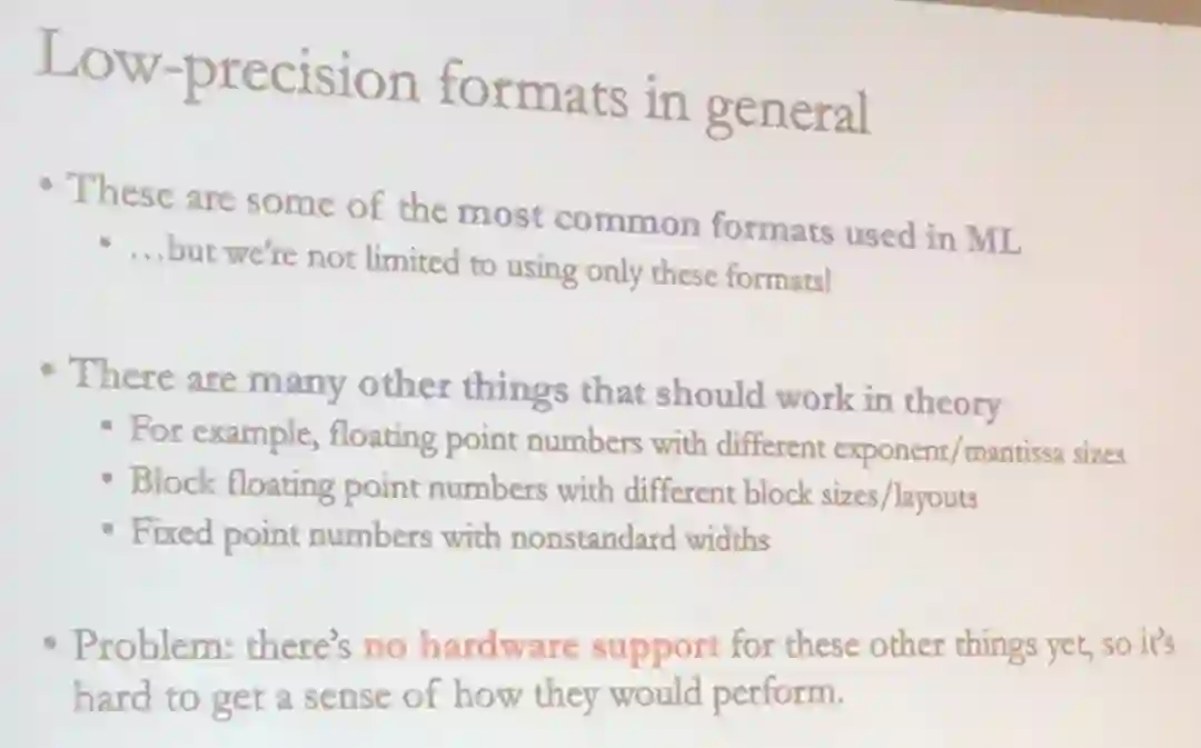 他总结了低精度的格式,并表示当前的问题是缺乏硬件支持。