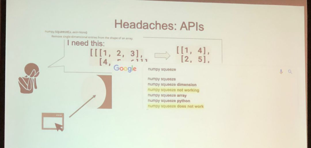 Lemieux 演讲的问答环节出现了一些不同的声音,一位来自谷歌的听众认为机器学习开发并不比传统软件开发更困难,也一样是「遨游于 API 之海」。