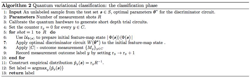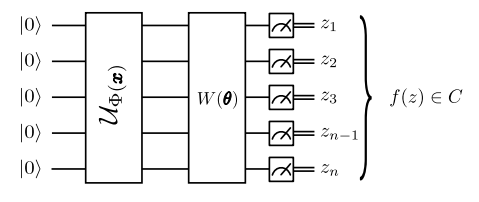 量子变分分类器使用变分量子电路实现,量子电路包含三部分:特征图编码、变分优化和度量。