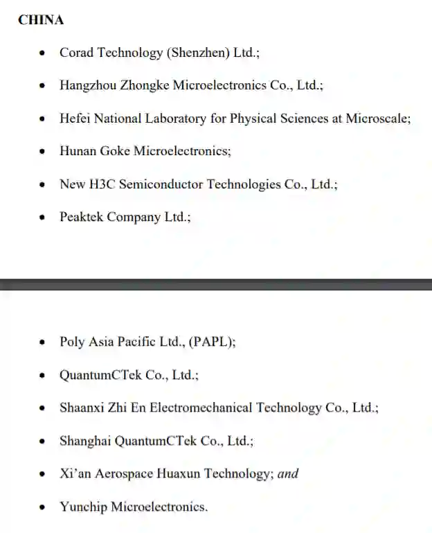 嘉兆科技(深圳)有限公司嘉兆科技有限公司从1980年创立以来,致力于为政府、科研机构、院校和厂商引进国外先进电磁兼容、微波测试、无线通讯、数据采集等方面的测试仪器和射频微波器件。嘉兆科技通过提供全面的本地应用支持,从而降低离岸成本并增加便利性,从而为全球 ATE 行业提供独特的产品。提供内部(非外包)设计、PCB 制造、元件采购、元件组装、Seica 测试、模拟和探针头组装服务。杭州中科微电子有限公司杭州中科微电子有限公司是国家高新技术企业和国家工信部认定的集成电路设计企业。公司坚持以人为本的经营理念,秉承"科技使生活更美好"的理念,坚持"用芯改变生活"的务实作风,营造"诚信、敬业、求实;合作、奋斗、创新"的企业文化与工作方法,不断培养和激发员工的学习力、想象力、创造力、战斗力。合肥微尺度物质科学国家研究中心合肥微尺度物质科学国家研究中心(以下简称微尺度国家研究中心)是科技部2017年11月批准组建的六个国家研究中心之一,依托于中国科学技术大学,是在合肥微尺度物质科学国家实验室筹建十余年的基础上组建。微尺度国家研究中心通过整合物理、化学、材料、生物和信息这五个一级学科的研究力量,在学科交叉与融合的基础上,形成一个以多学科综合为特点、以国家重大战略需求和交叉前沿领域为导向的新型基础科学研究中心。湖南国科微电子股份有限公司国科微电子股份有限公司成立于2008年,是国家规划布局内的重点集成电路设计企业,国家知识产权示范企业。国科微长期致力于存储、智能机顶盒、视频编解码、物联网等领域大规模集成电路及解决方案开发。公司每年将营业收入的20%以上用于研发,先后承担了国家科技重大专项、国家重点研发计划等一系列重大科研项目,在先进工艺制程的芯片及其终端产品上积累了大量知识产权,具备了快速研发及量产SoC芯片能力。新华三半导体技术有限公司紫光旗下新华三集团作为数字化解决方案领导者,致力于成为客户业务创新、数字化转型值得信赖的合作伙伴。新华三拥有计算、存储、网络、5G、安全等全方位的数字化基础设施整体能力,提供云计算、大数据、人工智能、工业互联网、信息安全、智能联接、新安防、边缘计算等在内的一站式数字化解决方案,以及端到端的技术服务。同时,新华三也是HPE®服务器、存储和技术服务的中国独家提供商。Peaktek Company Ltd.宝利亚太有限公司 Poly Asia Pacific Ltd. (PAPL)科大国盾量子技术股份有限公司科大国盾量子技术股份有限公司成立于2009年,公司是中国量子信息产业化的开拓者、实践者和引领者,主要从事量子保密通信产品的研发、生产、销售及技术服务,并前瞻布局量子计算等领域科研仪器的研发、生产和集成服务。公司践行“量子科技 产业报国”理念,推动产学研用协同创新。公司技术起源于中国科学技术大学,目前已逐步成长为全球少数具有大规模量子保密通信网络设计、供货和部署全能力的企业之一。公司为各类光纤量子保密通信网络以及“星地一体”广域量子保密通信网提供软硬件产品,推动量子保密通信网络和经典通信网络的无缝衔接,为政务、金融、电力、国防等各行业和领域的客户提供量子安全应用解决方案。上海国盾量子技术股份有限公司陕西智恩机电科技有限公司陕西智恩机电科技股份有限公司是一家集选冶技术、分析测试、环保工艺、产品研发、进出口贸易、工程项目为一体的综合性创新型企业,旗下包括矿业开发、环保事业、 贸易、工程项目四大板块。拥有自主研发矿虫环保提金剂、矿虫环保抑制剂、铜铅抑制剂、絮凝剂四大药剂产品以及自动取样设备、自动加药设备等自动化产品。目前已转化专利技术10余项,已完成研发正在申请的专利技术50余项,自主商标十余个。西安航天华迅科技有限公司西安航天华迅科技有限公司,是一家设计、研发、量产和销售GPS导航芯片的企业,也是中国北斗芯片产业领域主要的开拓者和领导者。主要从事GPS/北斗导航芯片和模块的设计、开发、生产和销售以及相关行业北斗导航应用系统解决方案的策划、制定和实施,是目前国内GPS/北斗核心芯片和模块的主要供应商之一。航天华迅已先后成功设计、研发和量产了四代十多款导航核心芯片,产品性能均达到国际先进水平。目前,公司正加紧研发最新一代高性能、低功耗、低成本的北斗/GPS双模导航定位射频、基带芯片,以及面向智能手机应用的基于40nm先进工艺技术的北斗/GPS+Bluetooth/WiFi/FM五合一集成SOC芯片。苏州云芯微电子科技有限公司苏州云芯微电子科技有限公司成立于2010年,致力于高速高精度数据转换器芯片和集成中射频、模拟、数字功能的集成芯片(SOC/SIP)的正向设计、开发、生产、销售。公司研发团队掌握高速高精度数据转换器芯片设计核心技术,拥有为国内企业提供定制化芯片开发设计的丰富经验。产品涵盖高性能模数转换器芯片(ADC)、数模转换器芯片(DAC)、直接数字式频率合成芯片(DDS)、正交数字上变频芯片(QDUC)、多频多模射频收发芯片(SOC/SIP)等多个门类。公司产品广泛应用于通信、测控等领域。参考资料:https://www.scmp.com/news/china/article/3157288/12-more-chinese-companies-are-placed-us-export-blacklisthttps://www.commerce.gov/news/press-releases/2021/11/commerce-lists-entities-involved-support-pr