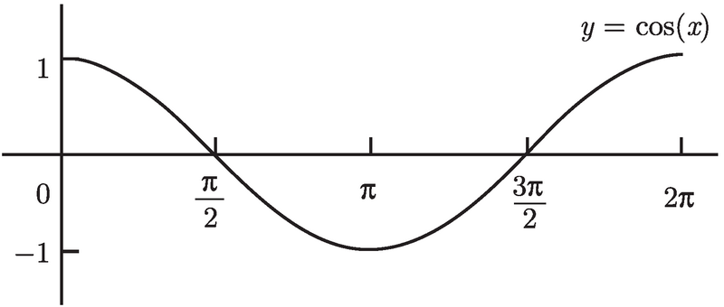 y = cos (x) 的图像和 y = sin (x) 的图像类似. 当 x 在从 0 到 2π 上变化时, 它看起来就像图 2-16.