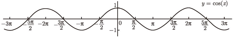 例如, 如果你想要求 cos (π), 只需从图像上读取, 你会看到结果是 -1. 此外, 注意到该图像关于 y 轴有镜面对称性. 这说明, cos (x) 是 x 的偶函数.