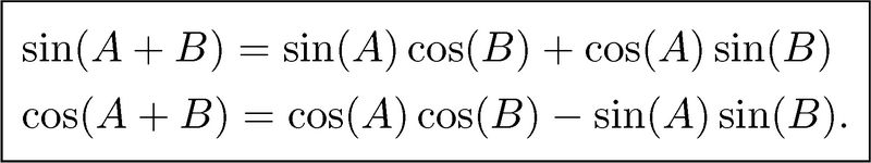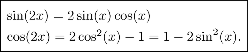 对于上述方框公式中的 sin (A + B) 和 cos (A + B), 令 A = B = x, 我们就会得到另一个有用的结果. 很明显, 正弦公式是 sin (2x) = 2 sin (x) cos (x). 但让我们更仔细看一下余弦公式. 它会变成 cos (2x) = cos2 (x) - sin2 (x); 这本身没错, 但更有用的是使用毕达哥拉斯定理 sin2 (x) + cos2 (x) = 1 将 cos (2x) 表示成为 2 cos2 (x) - 1 或 1 - 2 sin2 (x) (自已验证一下它们是成立的!). 综上, 倍角公式为: