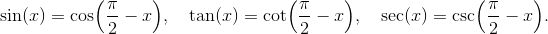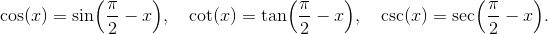 甚至当三角函数名中已经带有一个 “co” 时, 以上公式仍然适用; 你只需要认识到, 余角的余角就是原始的角! 例如, co-co-sin 事实上就是 sin, co-co-tan 事实上就是 tan. 基本上, 这意味着我们还可以说: