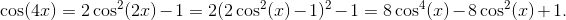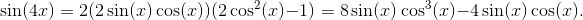 那么如何用 sin (x) 和 cos (x) 来表示 sin (4x) 呢?我们可以将 4x 看作两倍的 2x, 并使用正弦恒等式, 写作 sin (4x) = 2 sin (2x) cos (2x). 然后应用两个恒等式, 得到