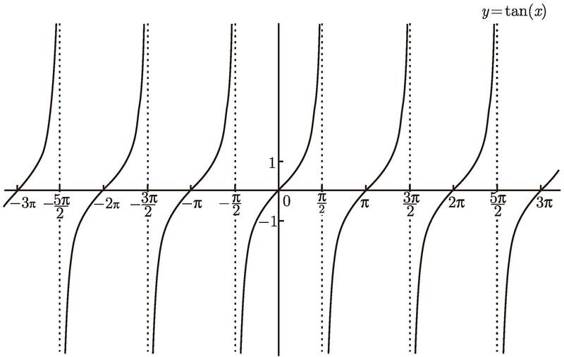 很明显, 当 x 是 π/2 的奇数倍数时, y = tan (x) 有垂直渐近线 (因而此处是无定义的). 此外, 图像的对称性表明, tan (x) 是 x 的奇函数.