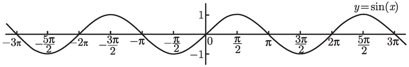 从图像中读值, 可以看到 sin (3π/2) = -1, sin (-π) = 0. 正如之前注意到的, 你应该这样去处理 π/2 的倍数的问题, 而不用再找参考角那么麻烦了. 另一个值得注意的是, 该图像关于原点有 180° 点对称性, 这意味着, sin (x) 是 x 的奇函数. (我们在 1.4 节中分析过奇偶函数.)
