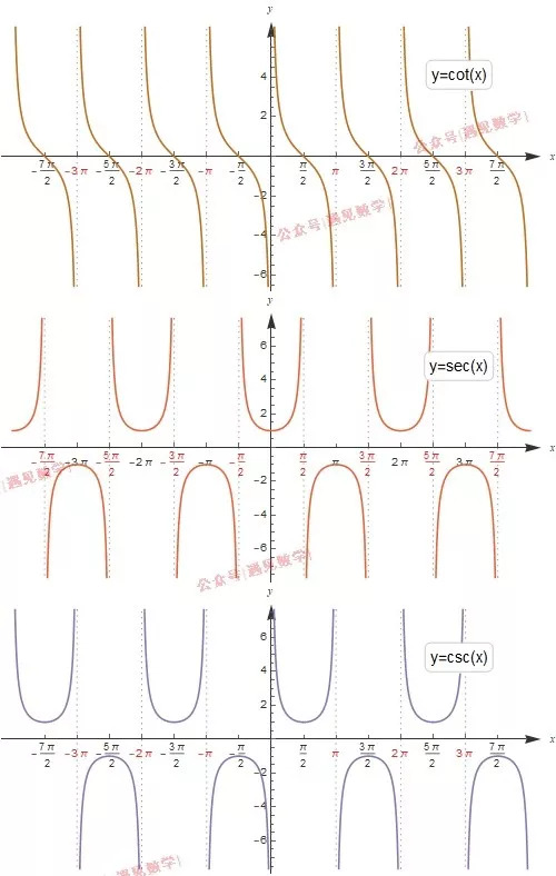 y = sec (x)、y = csc (x) 及 y = cot (x) 的函数图像也值得我们去学习, 它们如下图 所示.