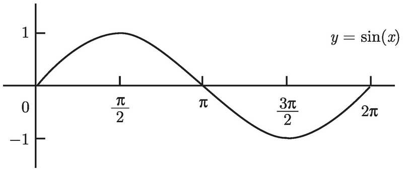记住正弦、余弦和正切函数的图像会非常有用. 这些函数都是周期的, 这意味着, 它们从左到右反复地重复自己. 例如, 我们考虑 y = sin (x). 从 0 到 2π 的图像看上去如图 2-14 所示.