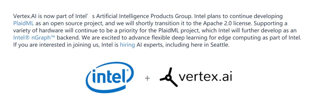 Vertex.AI 公司网站主页上的一则声明说,该公司日后将努力“支持多种硬件”,并计划将 PlaidML 与英特尔的 nGraph 机器学习后端进行整合。Vertex 同时表示,他们将继续开发 PlaidML,以将其作为 Apache 2.0 许可下的一个开源项目。
