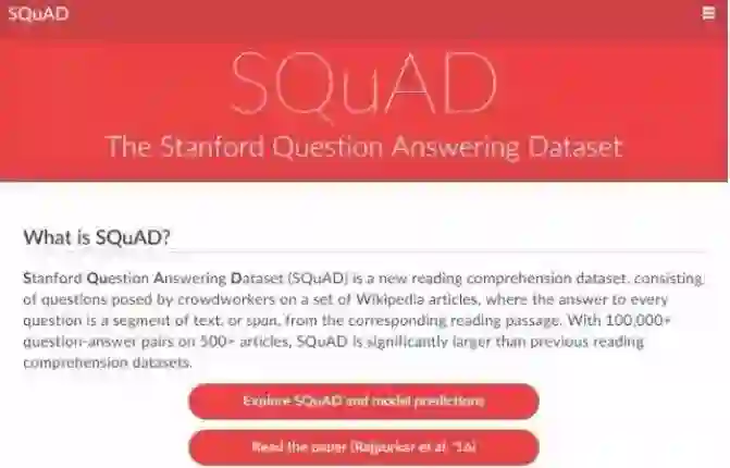 SQuAD 的全称是斯坦福问答数据集 (Stanford Question Answering Dataset),是由斯坦福大学自然语言处理实验室开发的数据集和比赛。SQuAD 的数据来自 Wikipedia 的文章。数据标注人员去掉了文章里的一些单词,并让参赛队伍利用模型重新填空,借以检测模型对文章的理解程度