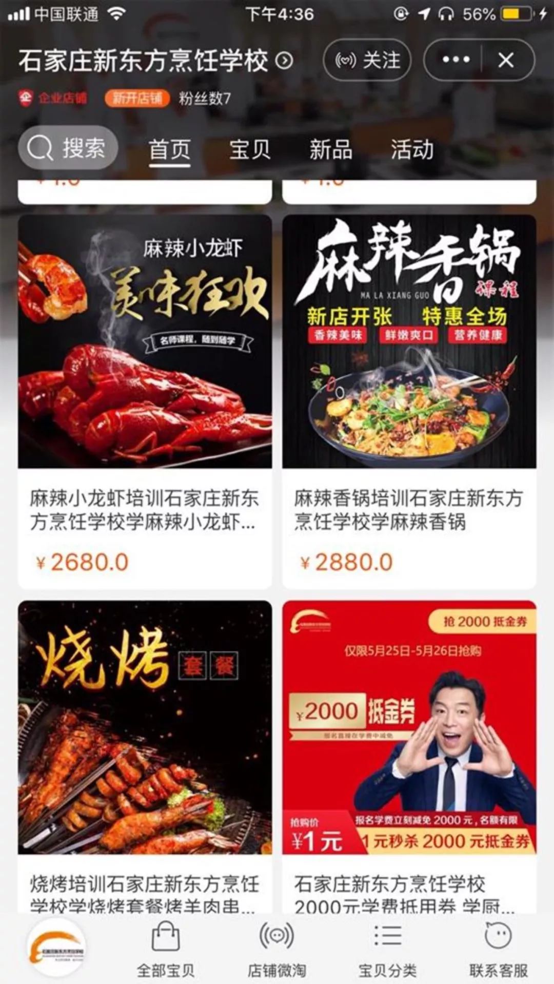 目前,新东方烹饪学校还在不断拓展厨师行业的细分类目,在淘宝上开起了网店,出售麻辣小龙虾、烧烤、麻辣香锅等课程,以及学费优惠券。