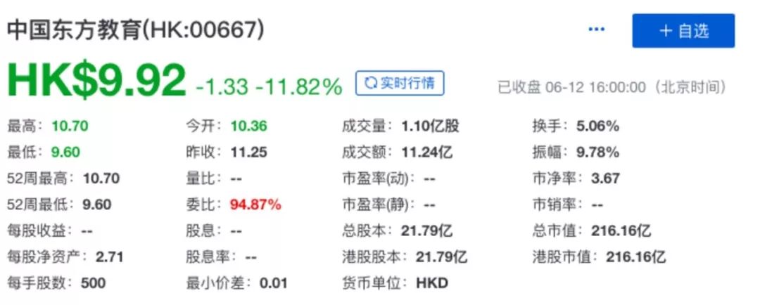但在首日,东方教育却遭开盘滑铁卢,低开7.91%,报10.36港元。截至昨日(6月12日)收盘,股价报9.92港元,跌幅11.822%,市值216.16亿港元。