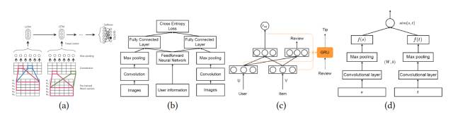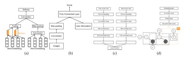 图 6:(a)基于 Attention 的 CNN;(b)个性化 CNN 标签推荐;(c)DeepCoNN;(d)ConvMF。