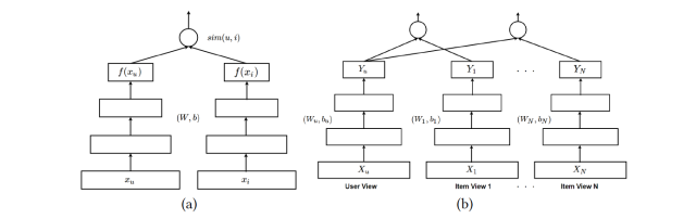图 8:(a)基于深度语义相似性的个性化推荐;(b)多视角深度神经网络。