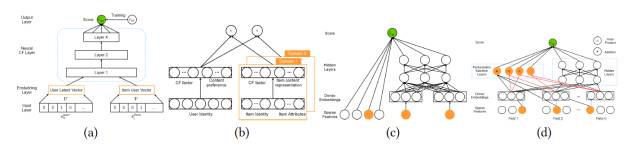 图 3:(a)神经协同过滤;(b)CCCFNet;(c)宽度&深度学习;(d)DeepFM。