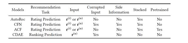 表 4:5 个基于自编码器的推荐模型之间的对比。