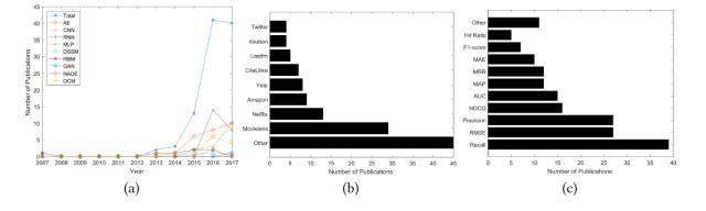 图 2:(a)使用的数据集;(b)使用的评测指标;(c)最有影响力的工作。
