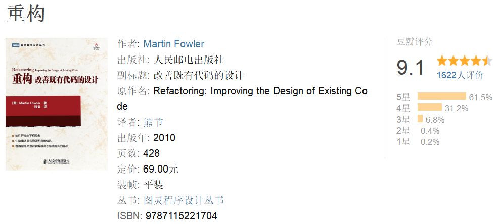 这本书主要帮助你了解什么是设计模式,以及介绍你的职业生涯中最常见的设计模式,读起来可能不是特别容易,书中的描述和例子都有点难理解,但我认为这是一本“必读”书籍,如果你觉得这本书对你有难度,那建议你从《Head First 设计模式》开始,书中的内容比较浅显易懂。