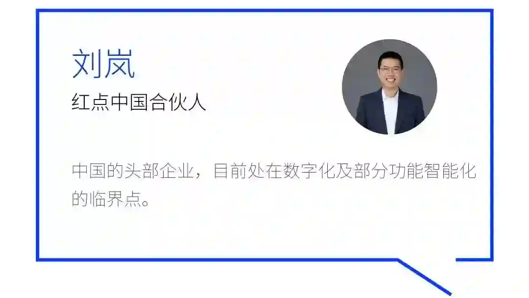 红点中国合伙人刘岚认为,回顾整个信息化数字化的变革历程,第一步是财务系统的数字化;然后是生产制造、内部运营流程、交流协作的数字化;再来则是与上下游供应链去做信息化数字化改造。这些都做完以后,关注点就放在了沉淀在IT系统上的数据,基于数据探索更深入的分析和智能决策。中国的头部企业,目前处在数字化及部分功能智能化的临界点。