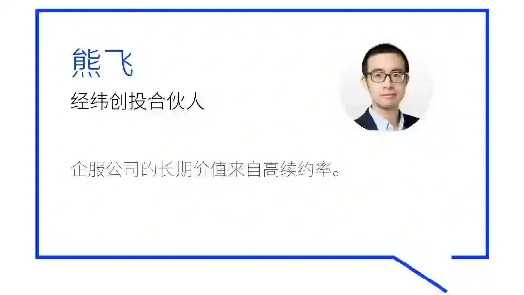 而要获得可持续增长的另外一个关键是高续约率。只有高续约,规模化增长速度才会快。熊飞把企服公司比作保险公司,“企服公司的长期价值来自高续约率”。