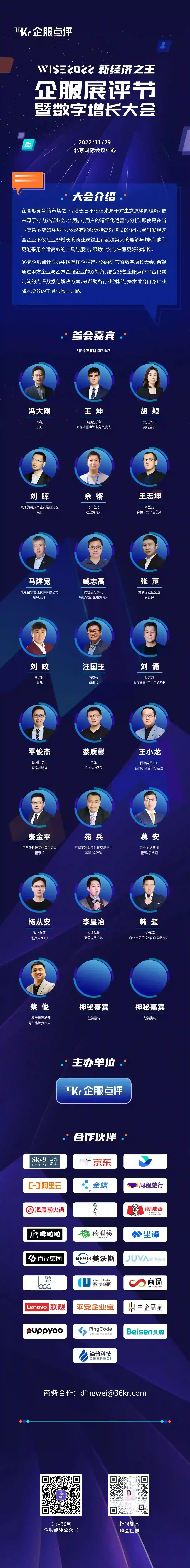 共享2023年企服发展机遇,了解餐饮、电商、零售、快消等等诸多行业的数字增长心法,请关注WISE 2022上将会登场的36氪企服展评节暨数字增长大会,36氪企服点评年度榜单也将同期发布,了解更多详情请看下图↓