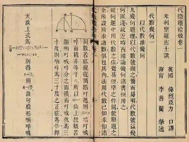 李善兰在1859年与英国传教士Alexander Wylie合作,翻译了Elias Loomis的「Elements of Analytical Geometry and of the Differential and Integral Calculus」(1850)。
