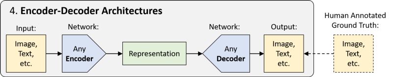 前 3 节中介绍的 FFNN、CNN 和 RNN 都只是分别使用密集编码器、卷积编码器或循环编码器进行预测的网络。这些编码器可以组合或切换,取决于我们试图形成有用表示的原始数据类型。“Encoder-Decoder” 架构是一种更高级的概念,通过对压缩表示进行上采样的解码步骤来生成高维输出,而不是进行预测。