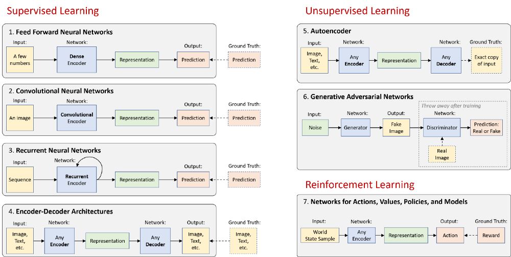 在下面的部分中,我将简要描述这 7 种架构范例,并提供每个范例的演示性TensorFlow 教程的链接。请参阅最后的 “基础拓展” 部分,该部分讨论了深度学习的一些令人兴奋的领域,不完全属于这七个类别。