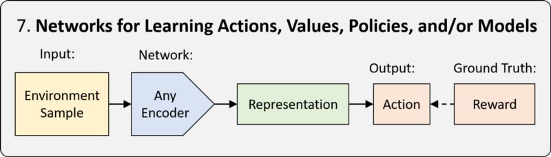 其余的则是一些聪明的方法,可以帮助我们有效地处理视觉信息、语言、音频 (第 1–6项),甚至可以在一个基于这些信息和偶尔的奖励的世界中采取行动 (第 7 项)。下面是一个总体的图示: