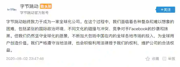 36氪获悉,8月2日晚,字节跳动官方账号发布动态称,字节跳动始终致力于成为一家全球化公司。在这个过程中,我们面临着各种复杂和难以想象的困难,包括紧张的国际政治环境、不同文化的碰撞与冲突、竞争对手Facebook的抄袭和抹黑。但我们仍然坚守全球化的愿景,不断加大包括中国在内的全球各地市场的投入,为全球用户创造价值。我们严格遵守当地法律,也会积极利用法律授予我们的权利,维护公司的合法权益。