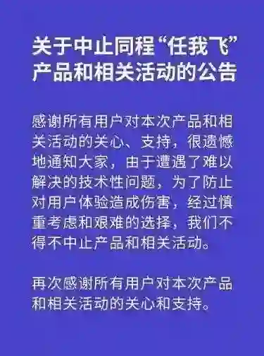 同程旅行“同程任我飞”产品中止,官方称因技术型问题